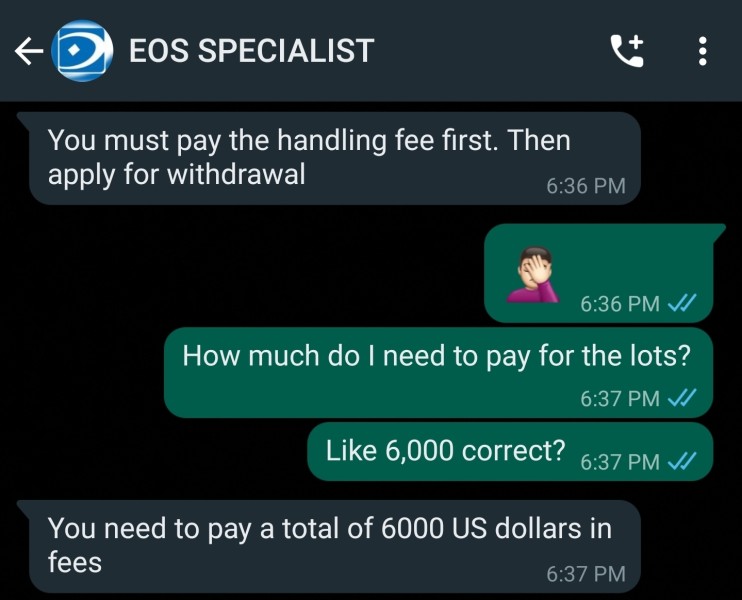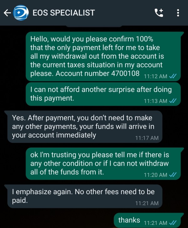 のレビューに基づいて EOS Globalwikifx では、出金の困難に関していくつかの一般的な問題が発生します。一部のレビュー担当者は、資金を引き出すことができず、引き出しを行う前に税金や追加料金の支払いを求められると主張しています。ブローカーが支払いを行わず、出金要求を無視する場合があり、トレーダーの不満を引き起こします。場合によっては、トレーダーが多額の資金がブロックされていると言及し、ブローカーが問い合わせに応じなくなることもあります。レバレッジや取引ロットなど、特定の取引活動に対してブローカーが高額な手数料や追加支払いを要求するという苦情もあります。