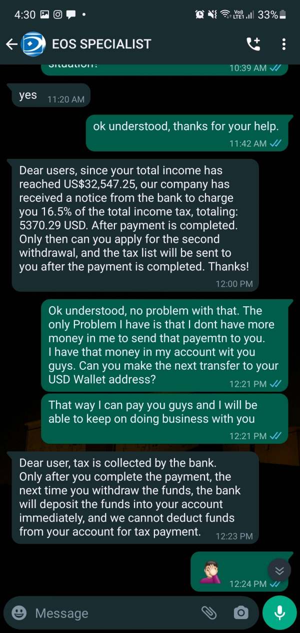 wikifx のレビューでは、出金の困難に関連する重大な問題が指摘されています。 EOS Global 。トレーダーらは、資金を引き出すことができなかったり、税金や追加料金の支払いを求められたり、ブローカーからの応答がなかったりしたと報告しています。これらのレビューは、有効な規制の欠如と併せて、取引活動を検討する際には注意が必要であることを浮き彫りにしています。 EOS Global 。