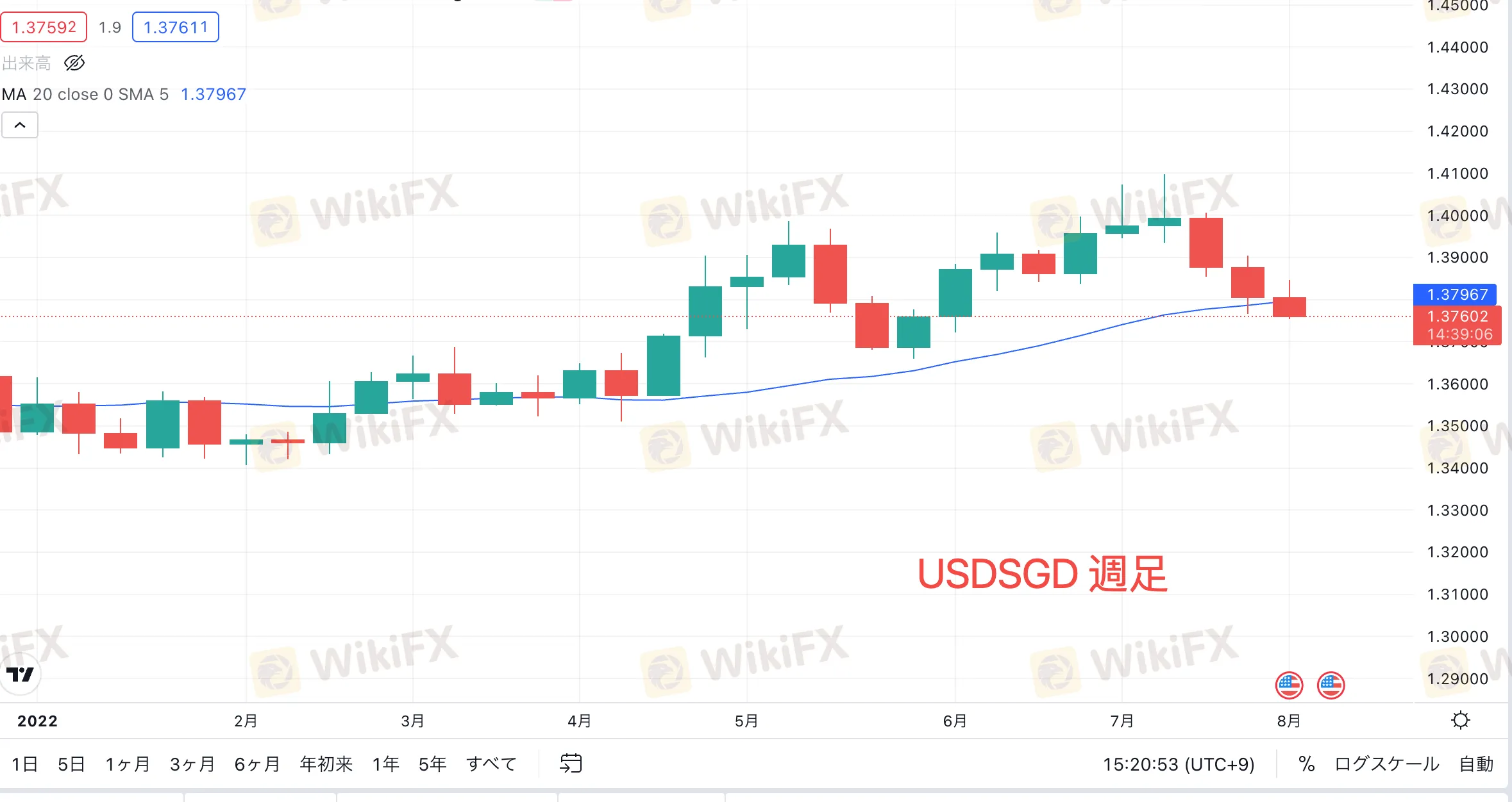 指標発表後、一時的に対米ドルで反落したシンガポールドルですが、ふたたび上昇基調へ戻っています。米ドル/ シンガポールドルは週足で3週連続陰線となっており、日足でも20MAよりも下位に位置しています。時間足では200SMAがレジスタンスとなり、下落を繰り返しています。