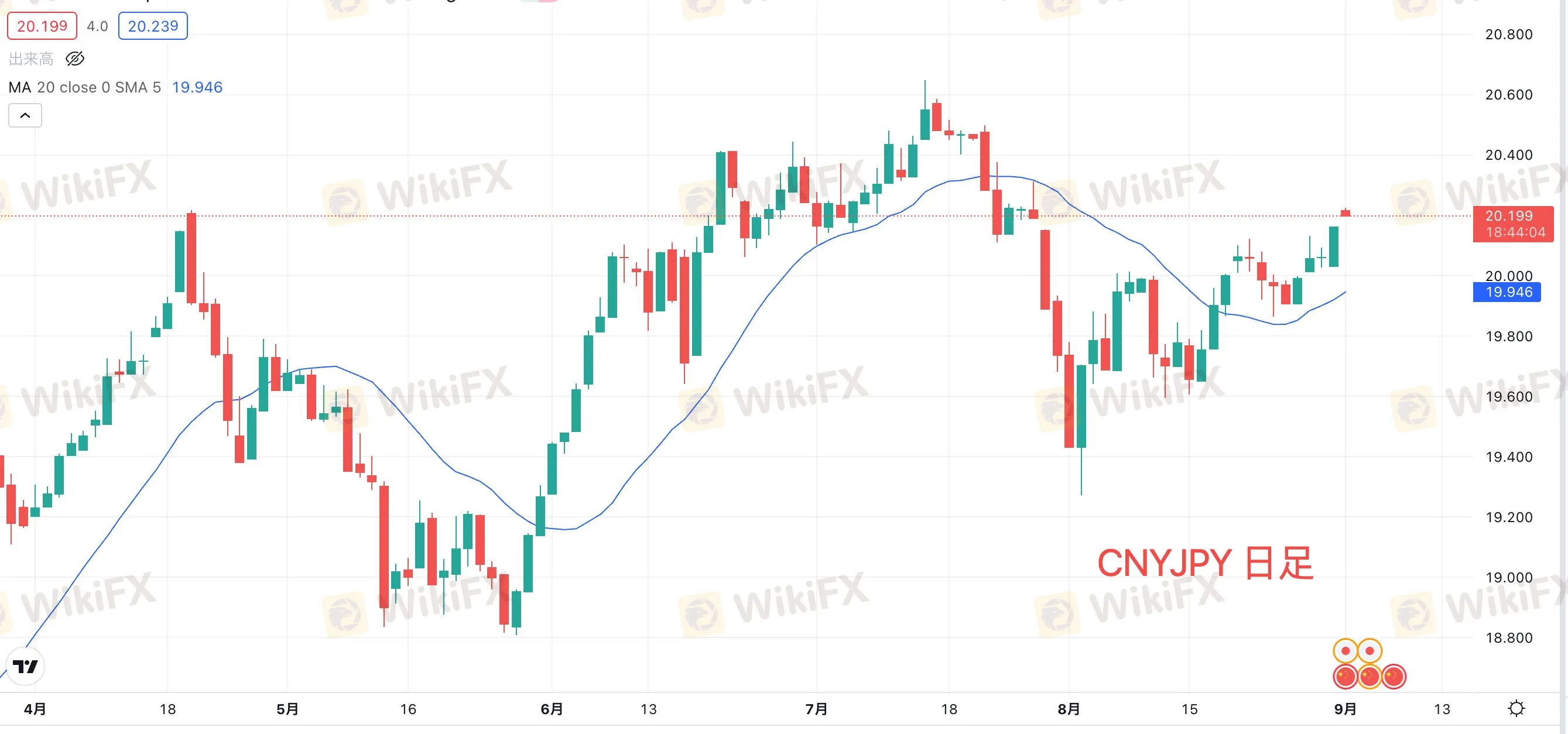 指標発表後、人民元円は一時的に反落しましたが、指標結果に反しその後すぐに回復しました。現在の人民元円は20.190付近で推移しており、直近1ヶ月での高値を更新しています。日足ベースではしっかりと20MAの上位に位置しており、5日MAの乖離率も0.4と低水準です。