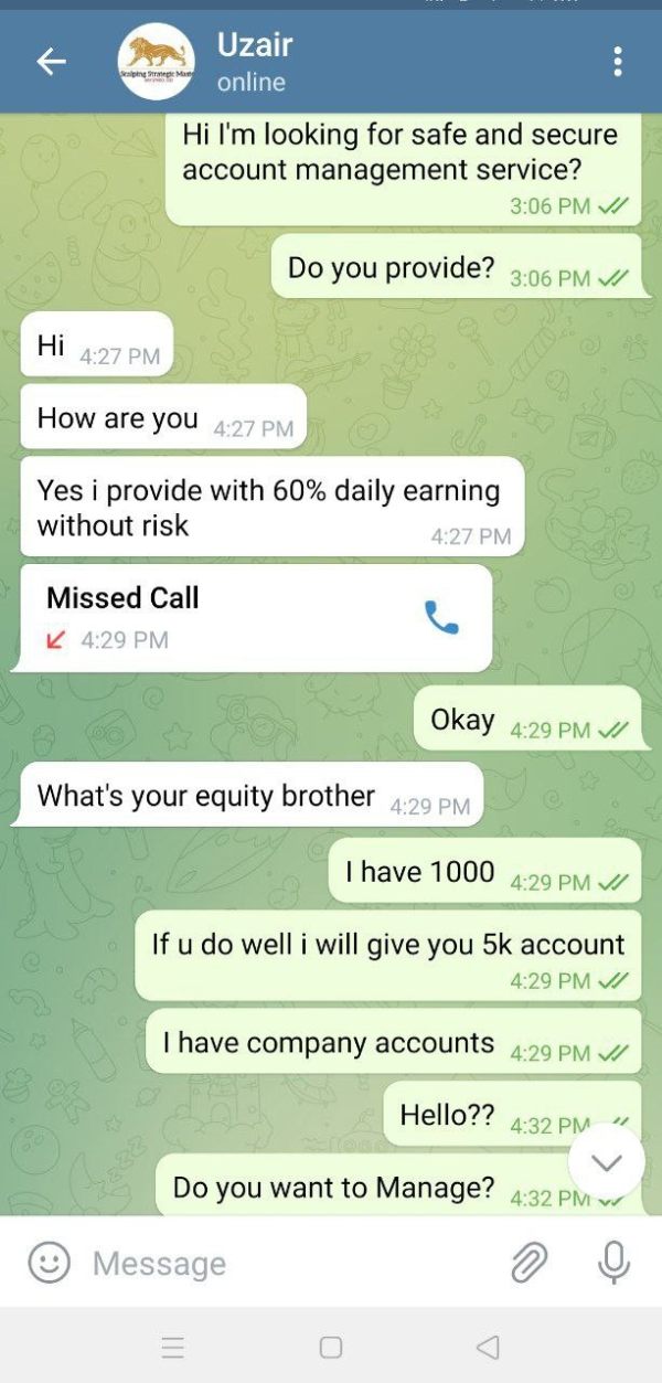 I contacted this guy who provides account management service. I found his service inside broker's telegram channel. So i decided to approach him. He told me he can give me a return of 60% daily. Originally i deposit 1k USD, but then i added more money because he guarantees 60% return daily. Only in 1 hour, 50% of my fund was gone! Ridiculous strategy and bad money management! I think he purposely lose the money so the broker can earn! He wont return or even answer my calls!