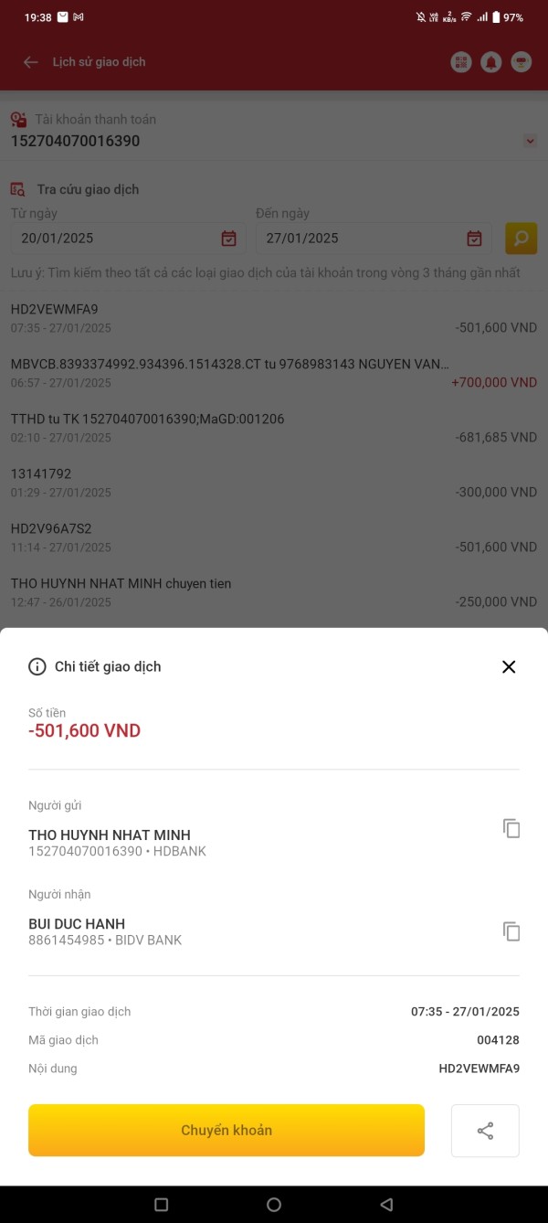 Ngày 27/01/2025 vào lúc 19:35 (7:35) tôi có nạp 20 đô vào tài khoản giao dịch, nhưng tới giờ vẫn chưa nhận được tiền vào tài khoản và tiền gửi đã bị khấu trừ