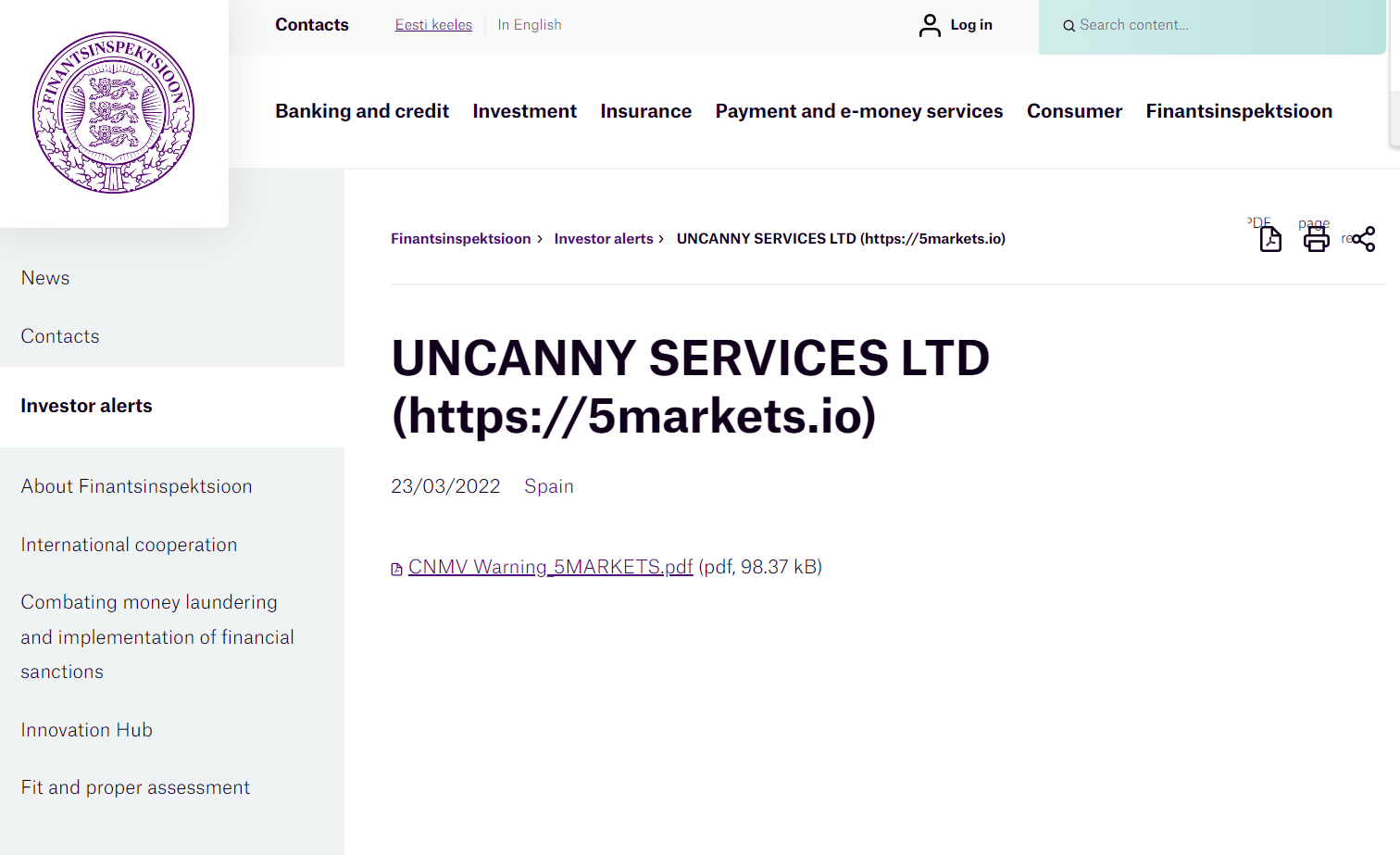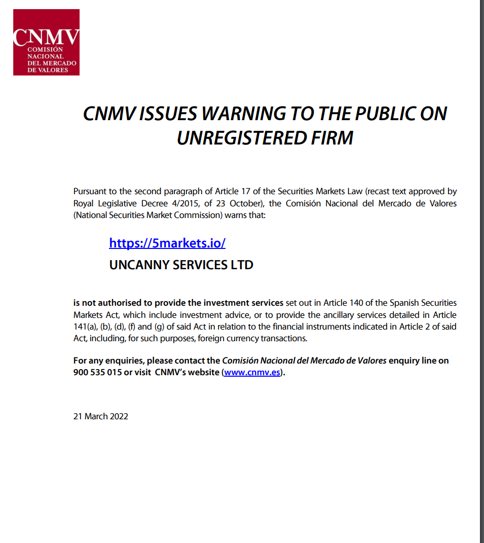 misterioso serviços ltd (https: // 5Markets .io) 23/03/2022 espanha cnmv emite alerta ao público sobre sociedade não registada nos termos do segundo parágrafo do artigo 17.º da lei dos mercados de valores mobiliários (texto reformulado aprovado pelo real decreto legislativo 4/2015, de 23 de outubro), a comisión nacional del mercado de valores (comissão nacional do mercado de valores mobiliários) alerta que: a uncanny services ltd não está autorizada a prestar os serviços de investimento previstos no artigo 140 da lei espanhola do mercado de valores mobiliários, que incluem consultoria de investimento, ou a prestar os serviços auxiliares detalhados em artigo 141 (a), (b), (d), (f) e (g) do referido ato em relação aos instrumentos financeiros indicados no artigo 2º do referido ato, incluindo, para tais fins, as operações em moeda estrangeira. para qualquer dúvida contacte a linha de consulta da Comissão Nacional do Mercado de Valores através do telefone 900 535 015 ou visite o site da CNMV (www.cnmv.es). 21 de março de 2022