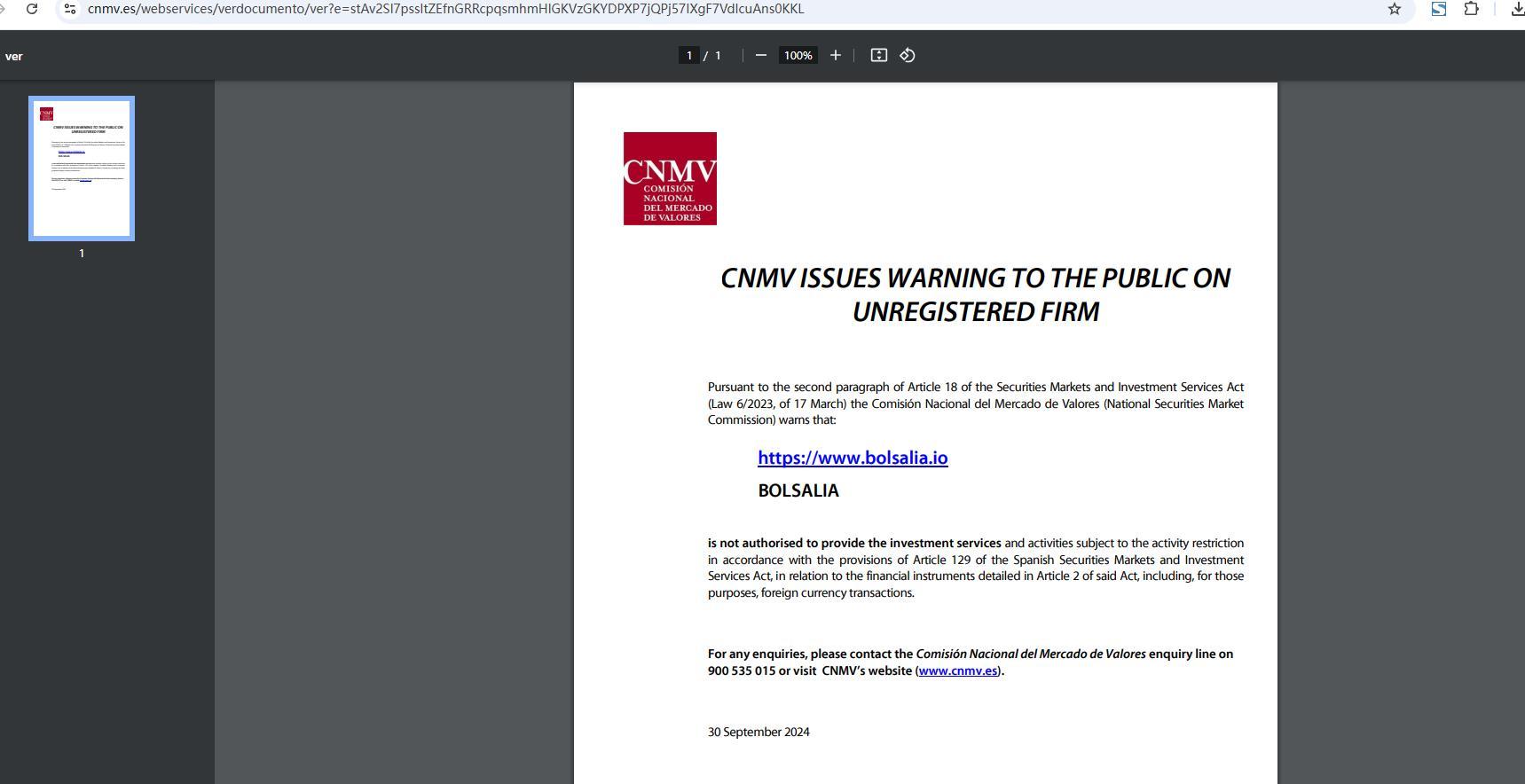 A cnmv emite alerta ao público sobre empresa não registrada, de acordo com o segundo parágrafo do artigo 18 da lei de mercados de valores mobiliários e serviços de investimento (lei 6/2023, de 17 de março). A comisión nacional del mercado de valores (comissão nacional do mercado de valores mobiliários) alerta que: https://www. Bolsalia .io Bolsalia não está autorizada a prestar os serviços e atividades de investimento sujeitos à restrição de atividade de acordo com as disposições do artigo 129 da lei espanhola de mercados de valores mobiliários e serviços de investimento, em relação aos instrumentos financeiros detalhados no artigo 2 da referida lei, incluindo, para esses fins, transações em moeda estrangeira. para qualquer dúvida, entre em contato com a linha de consulta da comisión nacional del mercado de valores no número 900 535 015 ou visite o site da cnmv (www.cnmv.es). 30 de setembro de 2024