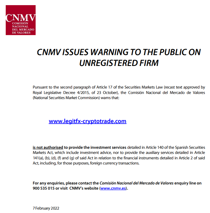 www. LegitFX-CryptoTrade .com 02.09.2022 Испания Cnmv выносит предупреждение общественности в отношении незарегистрированной фирмы в соответствии со вторым параграфом статьи 17 закона о рынках ценных бумаг (переработанный текст утвержден королевским законодательным указом 4/2015 от 23 октября), Национальная комиссия del mercado de valores (национальная комиссия по рынку ценных бумаг) предупреждает, что: www. LegitFX-CryptoTrade .com не уполномочен предоставлять инвестиционные услуги, описанные в статье 140 испанского закона о рынках ценных бумаг, включая инвестиционные консультации, а также предоставлять вспомогательные услуги, описанные в статье 141 (a), (b), (d), (f). ) и (g) указанного закона в отношении финансовых инструментов, указанных в статье 2 указанного закона, включая для этих целей операции в иностранной валюте. По любым вопросам обращайтесь в справочную комиссию по торговле товарами по телефону 900 535 015 или посетите веб-сайт cnmv (www.cnmv.es). 7 февраля 2022 г..