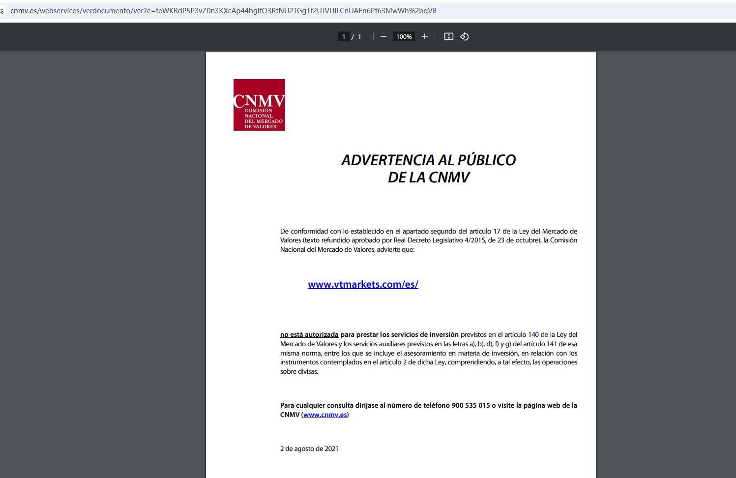 ПРЕДУПРЕЖДЕНИЕ ОБЩЕСТВЕННОСТИ ОТ CNMV В соответствии с положениями второго раздела статьи 17 Закона о рынке ценных бумаг (сводный текст утвержден Королевским законодательным указом 4/2015 от 23 октября) Национальная комиссия по рынку ценных бумаг предупреждает, что: http://www.vtmarkets.com/es/ не уполномочена предоставлять инвестиционные услуги, предусмотренные статьей 140 Закона о рынке ценных бумаг, и дополнительные услуги, предусмотренные в пунктах a), b), d), f) и g) статьи 141 того же закона, которые включают инвестиционные консультации в отношении инструментов, предусмотренных в статье 2 указанного Закона, включая, для этой цели, валютные операции. По любым вопросам звоните по телефону 900 535 015 или посетите сайт CNMV (www.cnmv.es) 2 августа 2021 г.