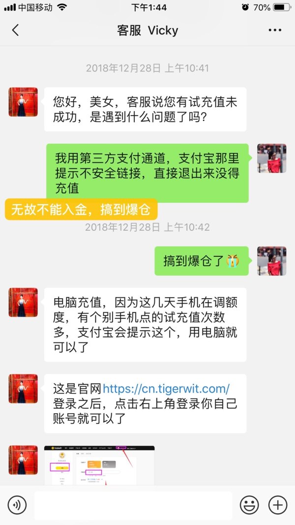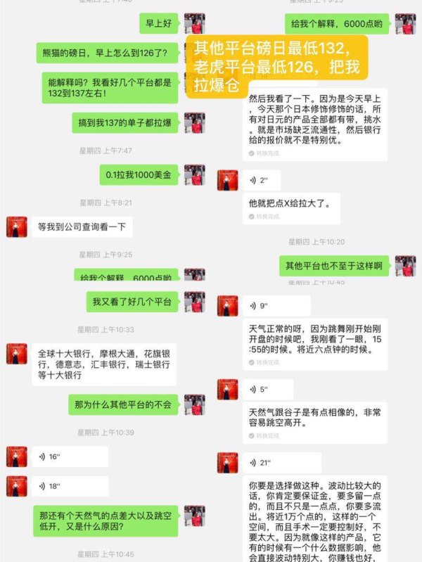 1.老虎外汇所谓监管号是套牌。老虎外汇入金为通过支付宝平台入金,实质上是白标MT4玩内外盘,如:出入金的收款人或者付款人均为个人账户,如入金收款人为:中喆能源科技(北京)有限公司,出金付款人为:蔡玉楠,存在资金根本没有流入到国际外汇市场交易,是老虎外汇和客户做对赌的疑点。经外汇管理局核查此公司资金根本没有流入到国际外汇市场交易,是老虎外汇和客户做对赌。 2.老虎外汇未与国际平台接轨。老虎外汇出入金的通过人民币转换为美元,但汇率却与市场价不一致,如:2018年12月10日,入金1美金=6.8936人民币,出金却按1美金=6.8018人民币,当天美元对人民币为6.91780至6.89590之间;2018年11月28日,出金按1美元=6.8691,当天美元对人民币为6.94890至6.95764之间;存在三方面问题:一是出入金的不按市场价,存在老虎外汇和客户做对赌嫌你;二是出入金过程中平台再无故收取客户的手续费,同时,出金到客户账户手续费高于入金手续费。三是入金只需要3分钟左右,出金却需要5天左右,存在出入金时间不对等、平台未与国际平台接轨的情况。 3.老虎平台多次无法正常入金导致客户账户爆仓。老虎外汇经常无法正常入金,导致客户保证金不足爆仓。老虎外汇在10月至12月期间,我多次入金都被退回,从而显示“交易关闭”无法正常入金,进而导致我的账户爆仓。 4.老虎平台交易时存在巨大滑点和卡盘导致客户账户爆仓或无法平仓。交易时存在巨大的滑点和卡点,尤其是大数据行情下系统市场出现不稳定性的情况,导致我的账户多次出现平仓时利润被平成负数或者平不掉。如:2019年1月3日开盘时,英镑对日元无故从137.301滑到126.387,下滑接近11美金,导致我137.87和138.15的单子被爆仓,经查看多个交易平台和金十数据、英镑对日元最低点一般在132至135之间,老虎外汇却初心如此大的滑点。同时,天然气的点差设在95-145之间,这属于老虎外汇后台调自己增加点差手续费,一手天然气单子在点差100左右这意味着做一手单子想回本都需要100个点才能回本,也就是点差加手续费超过一千美金之外的才能算你的盈利,成本高的离谱,根本很难回本更不要说赚钱了。 5.老虎平台交易时存在卡盘导致客户账户无法平仓。交易时存在卡盘,尤其是大数据行情下系统市场出现不稳定性的情况,无论是MT4平台还是老虎APP均无法正常显示,经询问客服人员说是我的网络问题,但其他平台可正常显示。由此导致我的账户多次出现平仓时利润被平成负数或者平不掉。 6.我对客户服务员询问熊猫外汇下架问题时,客服无如实作答,也未将熊猫外汇改为老虎外汇作出说明。聊天记录为2018年10月18日。 7.客服利用推荐新客户送红包的模式,引诱我拉新的人员使用老虎外汇。