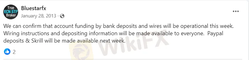 BlueStarFX, yatırma ve çekme işlemleri için çeşitli ödeme yöntemleri sunmaktadır ve seçenekleri arasında banka transferleri, PayPal ve Skrill bulunmaktadır. Verimli çekme işlemlerini teşvik eder ve çekme miktarlarına veya belirli zamanlamalara sınırlama olmadığını iddia eder.