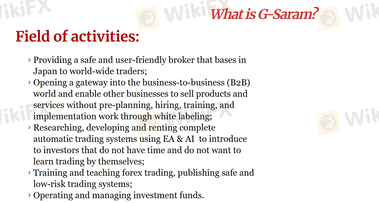 G-Saram cung cấp một nền tảng giao dịch an toàn dựa trên Nhật Bản cho các nhà giao dịch toàn cầu. Ngoài ra, nó còn cho phép doanh nghiệp cung cấp sản phẩm/dịch vụ thông qua nhãn hiệu trắng và phát triển hệ thống giao dịch tự động với trí tuệ nhân tạo cho các nhà đầu tư. Ngoài ra, G-Saram còn cung cấp đào tạo giao dịch ngoại hối và quản lý quỹ đầu tư.