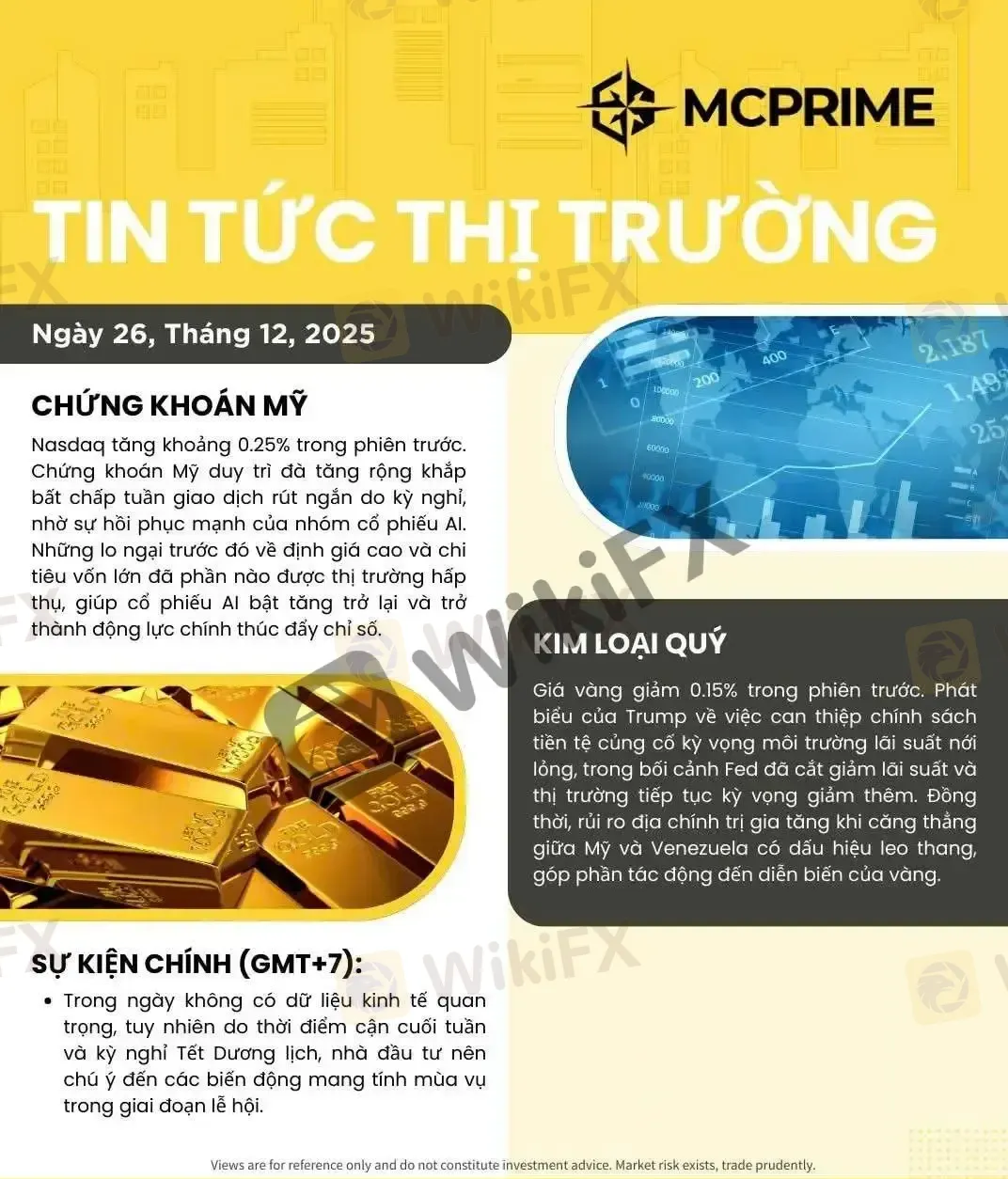 Lời nói đầu:Thị trường ngày 26/12:🔸 Chứng khoán Mỹ: Nasdaq tăng 0.25%, nhờ cổ phiếu AI hồi phục mạnh sau đợt điều chỉnh trước.🔸 Vàng: giảm 0.15%, chịu ảnh hưởng từ chính sách tiền tệ và căng thẳng địa chính trị