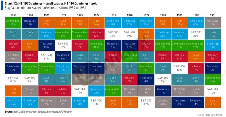Theo báo cáo dòng tiền ngày 22/1 của Bank of America, ngân hàng này so sánh bối cảnh của thập niên 1970 với giai đoạn hiện tại. Trong nửa đầu thập niên 1970, nhóm cổ phiếu “Nifty Fifty” đạt đỉnh vào năm 1972; giai đoạn 1971–1974, vàng là tài sản có hiệu suất vượt trội nhất; tiếp đó, từ 1975–1977, cổ phiếu vốn hóa nhỏ tiếp quản vai trò dẫn dắt thị trường.