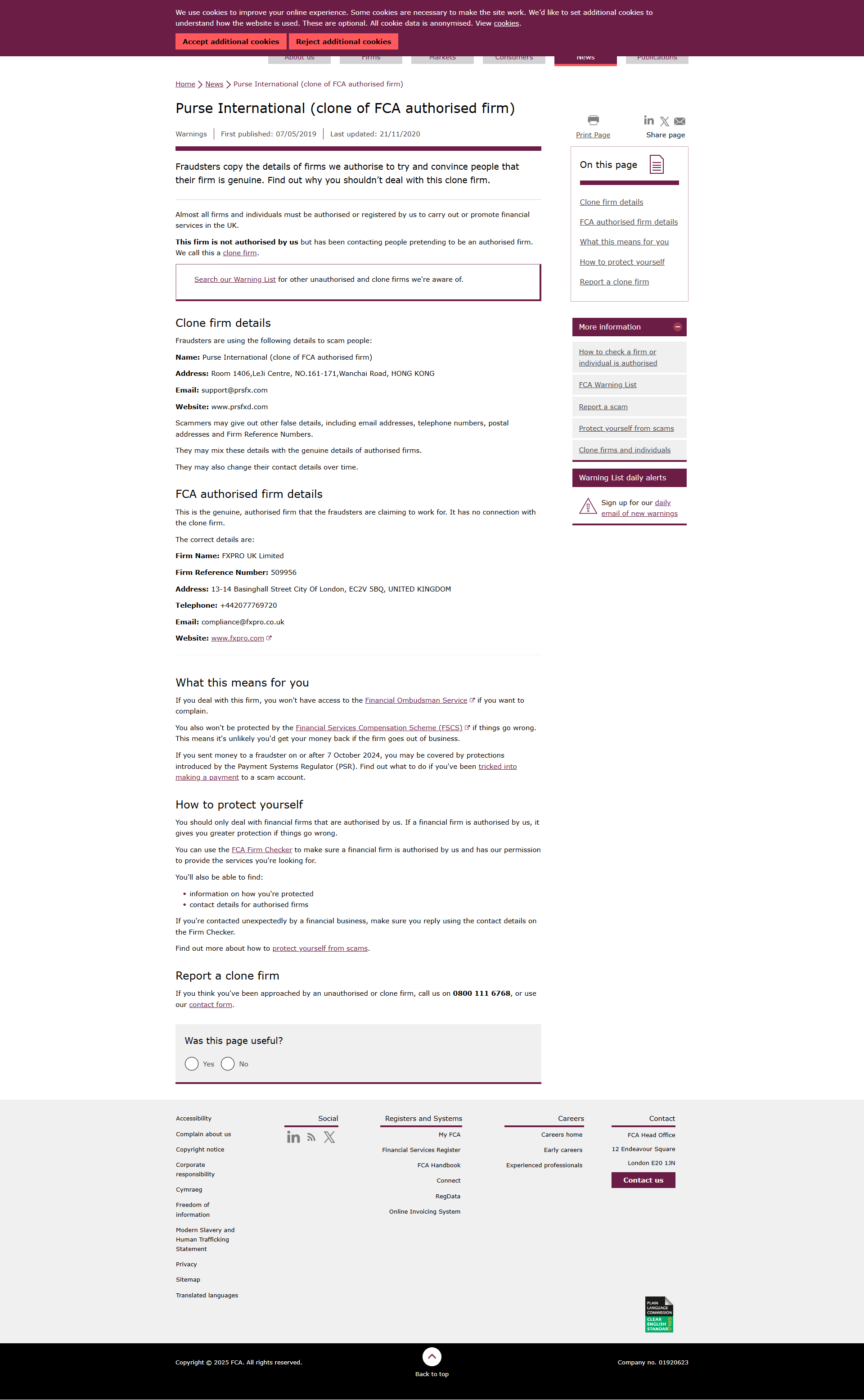 Cảnh báo Được xuất bản lần đầu: 07/05/2019 Cập nhật lần cuối: 21/11/2020 Những kẻ lừa đảo sao chép thông tin của các công ty được chúng tôi ủy quyền để cố gắng thuyết phục mọi người rằng công ty của họ là thật. Tìm hiểu lý do tại sao bạn không nên giao dịch với công ty sao chép này. Hầu hết tất cả các công ty và cá nhân phải được chúng tôi ủy quyền hoặc đăng ký để thực hiện hoặc quảng bá các dịch vụ tài chính tại Vương quốc Anh. Công ty này không được chúng tôi ủy quyền nhưng đã liên hệ với mọi người giả mạo là một công ty được ủy quyền. Chúng tôi gọi đây là công ty sao chép. Tìm kiếm Danh sách Cảnh báo của chúng tôi để biết các công ty không được ủy quyền và công ty sao chép khác mà chúng tôi biết. Chi tiết công ty sao chép Những kẻ lừa đảo đang sử dụng các thông tin sau để lừa đảo mọi người: Tên: Purse International (bản sao của công ty được FCA ủy quyền) Địa chỉ: Phòng 1406, Trung tâm LeJi, số 161-171, đường Wanchai, HỒNG KÔNG Email: hỗ trợ@prsfx.com Website: {. 1} Những kẻ lừa đảo có thể cung cấp các thông tin sai lệch khác, bao gồm địa chỉ email, số điện thoại, địa chỉ bưu điện và Số Tham Chiếu Công Ty. Họ có thể trộn lẫn những thông tin này với thông tin thật của các công ty được ủy quyền. Họ cũng có thể thay đổi thông tin liên lạc theo thời gian. Thông tin công ty được FCA ủy quyền Đây là công ty được ủy quyền thực sự mà những kẻ lừa đảo đang giả mạo làm việc cho. Công ty này không có liên kết với công ty sao chép. Thông tin chính xác là: Tên công ty: FXPRO UK Limited Số tham chiếu công ty: 509956 Địa chỉ: 13-14 Basinghall Street City Of London, EC2V 5BQ, VƯƠNG QUỐC ANH Điện thoại: +442077769720 Email: compliance@fxpro.co.uk Trang web: www.fxpro.comLink is external Điều này có ý nghĩa gì với bạn Nếu bạn giao dịch với công ty này, bạn sẽ không có quyền truy cập vào Dịch vụ Ombudsman Tài chính nếu bạn muốn khiếu nại. Bạn cũng sẽ không được bảo vệ bởi Chương trình Bồi thường Dịch vụ Tài chính (FSCS) nếu có sự cố xảy ra. Điều này có nghĩa là bạn khó có thể lấy lại tiền nếu công ty phá sản. Nếu bạn đã gửi tiền cho kẻ lừa đảo vào hoặc sau ngày 7 tháng 10 năm 2024, bạn có thể được bảo vệ bởi các quy định do Cơ quan Quản lý Hệ thống Thanh toán (PSR) ban hành. Tìm hiểu cách xử lý nếu bạn bị lừa chuyển tiền vào tài khoản lừa đảo. Cách tự bảo vệ mình Bạn chỉ nên giao dịch với các công ty tài chính được chúng tôi cấp phép. Nếu một công ty tài chính được chúng tôi cấp phép, bạn sẽ được bảo vệ tốt hơn nếu có sự cố xảy ra. Bạn có thể sử dụng Công cụ Kiểm tra Công ty FCA để đảm bảo rằng công ty tài chính đó được chúng tôi cấp phép và có quyền cung cấp các dịch vụ bạn đang tìm kiếm. Bạn cũng có thể tìm thấy: thông tin về cách bạn được bảo vệ chi tiết liên hệ cho các công ty được ủy quyền Nếu bạn được liên hệ bất ngờ bởi một doanh nghiệp tài chính, hãy đảm bảo bạn trả lời bằng cách sử dụng thông tin liên hệ trên Công cụ Kiểm tra Công ty. Tìm hiểu thêm về cách bảo vệ bản thân khỏi các trò lừa đảo..