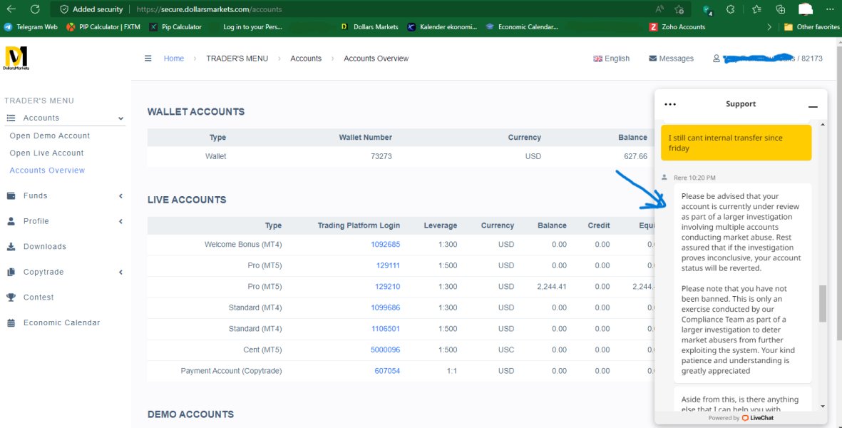 Every day they have a smarter way and seem to have carried out procedures and audits. But this is just a scam. If you have just created an account, initially you can trade as with a normal broker. However, when you have made a profit and want to withdraw funds greater than the deposit you have made, then what happens is: - Dollars Market locks your account, arguing: "your account is currently under review as part of a larger investigation involving multiple accounts conducting market abuse." - Helpdesk continues to serve your complaint well but persists for the reasons above. - You can still trade with Metratrader but you will most likely experience a margin call. - A week later you will receive an email with the content: "It seems that your account has been found to be in violation of our trading rules, section 8.1 classified under 'Abusive Trading'. As such, your account has been disabled." - You have been accused of cheating and your account has been disabled. Can't login anymore -Act like a swindler, the email also offers you to withdraw on condition that the deposit value is greater than the withdrawal value. But it's actually done. You begin to understand that so far you have only traded with Dollarsmarkets not the market.