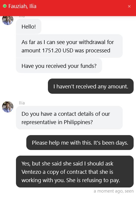 With Authority, as the one trading her account at Ventezo I am making this exposure. This is regarding the withdrawal funds made on 17 August 2023 by my classmate from her Ventezo account amounting to One Thousand Seven Hundred Fifty One USD and Twenty USD Cents (1,751.20USD) which until now have not deposited to her designated bank account. Her email from Ventezo shows that withdrawal has been completed already likewise it was recognized by the Ventezo Chat Support that the withdrawal has been processed already. But that is not the case as the truth is my classmate have not yet receive the amount withdrawn.