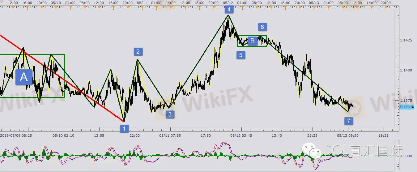 摘要:上图是EUR/USD的5 min图形,在3号点没有跌破1号点的时候,升破2号点,就标志着之前4小时(4H)级别的下跌宣告结束,随后5号点开始的 30 min级别的上涨,并没有升破4号高点,并且随后跌破了5号低点。后面查考