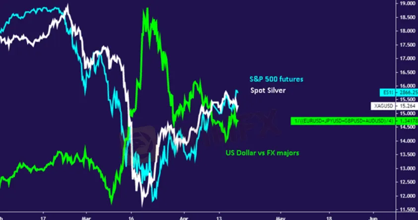 白银价格在COVID-19疫情爆发期间,与股市走势相一致,与美元走势相反。3月下旬,随时广泛的封锁令导致全球经济陷入停滞,给信贷市场带来了压力,并引发清算潮,黄金价格与股市、多数G10货币汇率以及周期敏感的大宗商品等资产一同大幅下跌