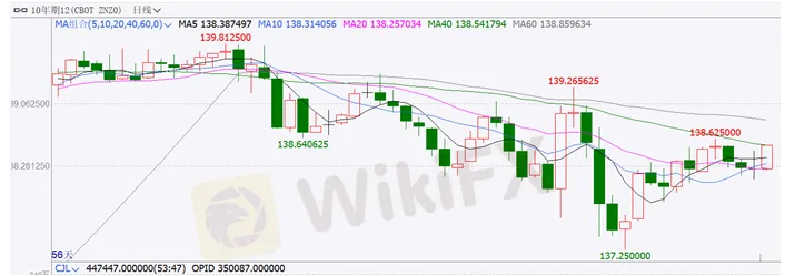 当地时间11月23日-11月27日一周,美国十年期国债主力合约ZNZO高位震荡运行,收报138.546,涨幅0.01%,成交量806.4万,持仓量35万。11月随着美国大选开启,市场不确定性因素逐渐落地,11月初拜登选票领先,市场普遍预期拜登当选并开启经济复苏预期,市场风险偏好明显提升,权益市场反弹至前期高位,债市走弱。但由于欧美疫情再次抬头的影响逐渐反映在当周初请失业金人数以及新一轮刺激计划尚未落地的影响,十年期美债触底反弹。近期受疫情抬头、疫苗利好和经济复苏预期的综合影响,十年期美债高位震荡运行。