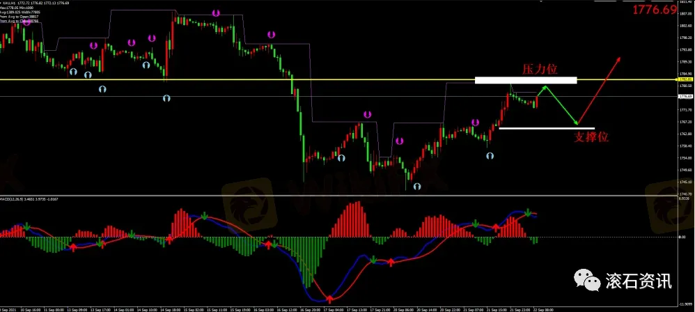 从小时线来看,目前黄金的走势仍然存在继续上涨的力度,1小时的布林带轻微开口,MACD红色能量柱持续放量,MA5均线上移力度较小,短期内上方的压力开始逐步加大,小时线破位力度较大,但是布林带整体的开口不符合单边趋势,所以走势还是处于1783一线的阻力下方综合来看,今日黄金操作思路上建议以反弹高空为主,