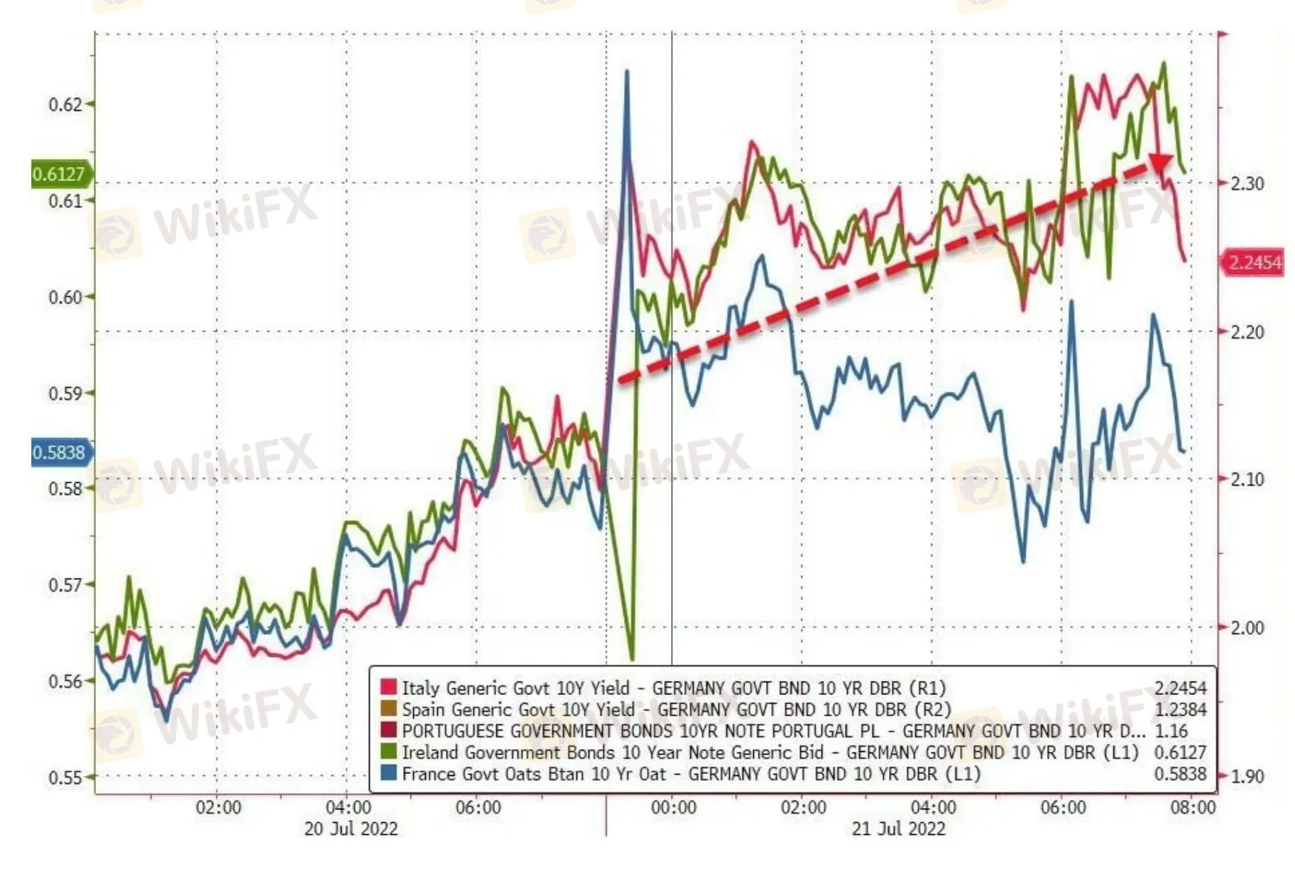 欧央行21日在 7 月会议宣布 11 年来首次的升息,升息两码,超过市场预期的一码,而超出预期升息主要是因为欧洲央行推出了新的碎片化工具:传导保护机制(Transmission Protection Instrument,TPI)」,目的为防止欧元区国家之间国债利差扩大,避免欧债风暴再度上演。 TPI此举简单来说是把欧央行把债券到期后再融资的钱,去买外债、财政体质较差国家债券,而此次甚至传出可买公司债券,极力不让意大利和德国的国债殖利率利差扩大。当然站在财务体质较好的北欧国家肯定不愿意,谁愿意把自己的钱去补贴南欧债务庞大的穷国,这也造成欧元区内部矛盾加大。利率决议后明显看出意大利与德国利差飙高,市场几乎不领情,也反应传导保护机制(TPI)可能效果有限。