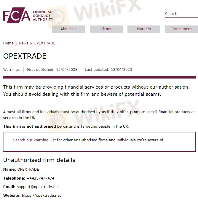 FCA警告称:OPEXTRADE 在未经我们授权的情况下在英国提供金融服务或产品,如果一旦遭受资金损失,您将无法使用金融申诉专员服务或受到金融服务补偿计划 (FSCS) 的保护。