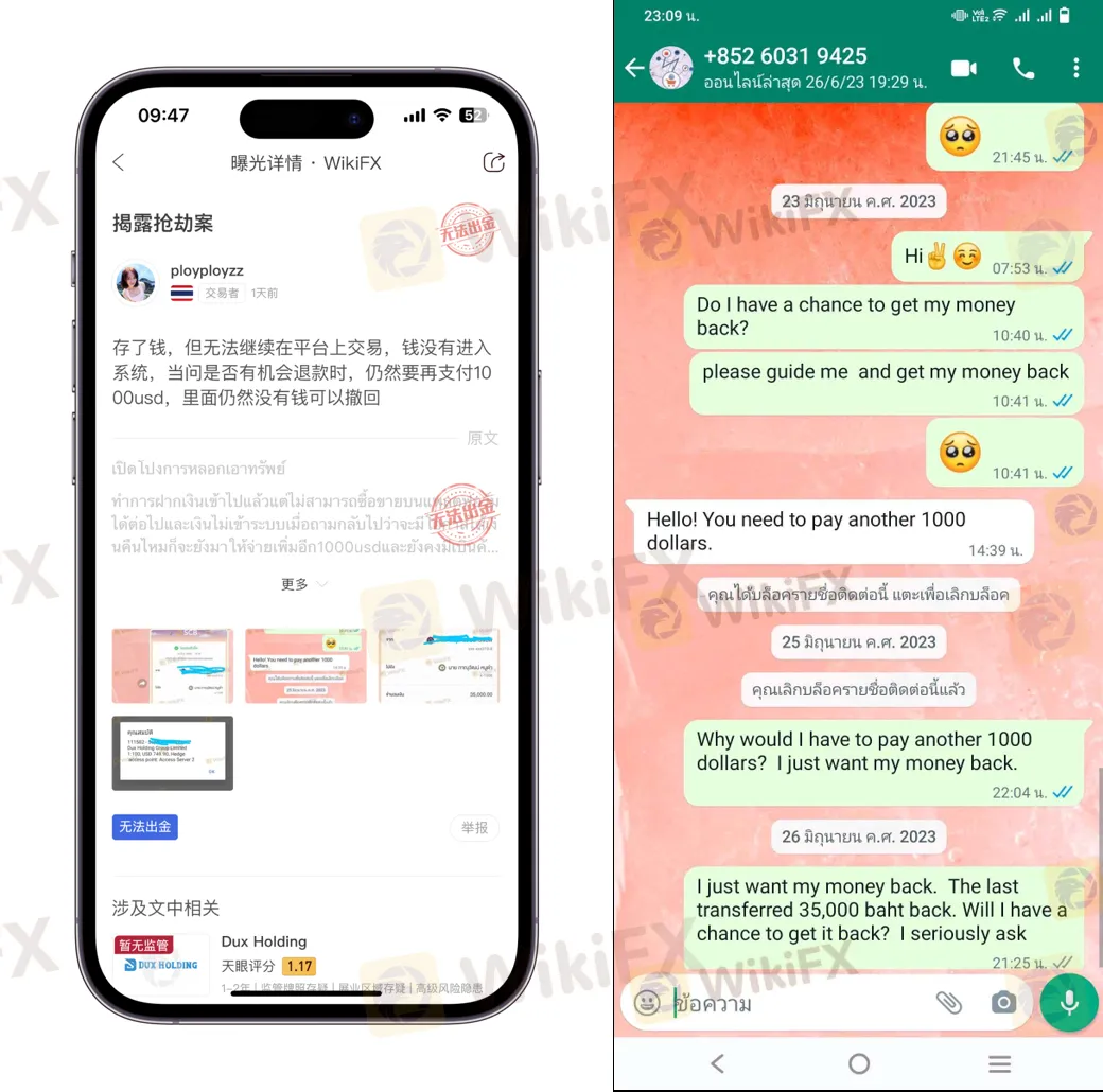 日前,一位泰国投资者向WikiFX揭露了Dux Holding平台的“盗窃行为”。