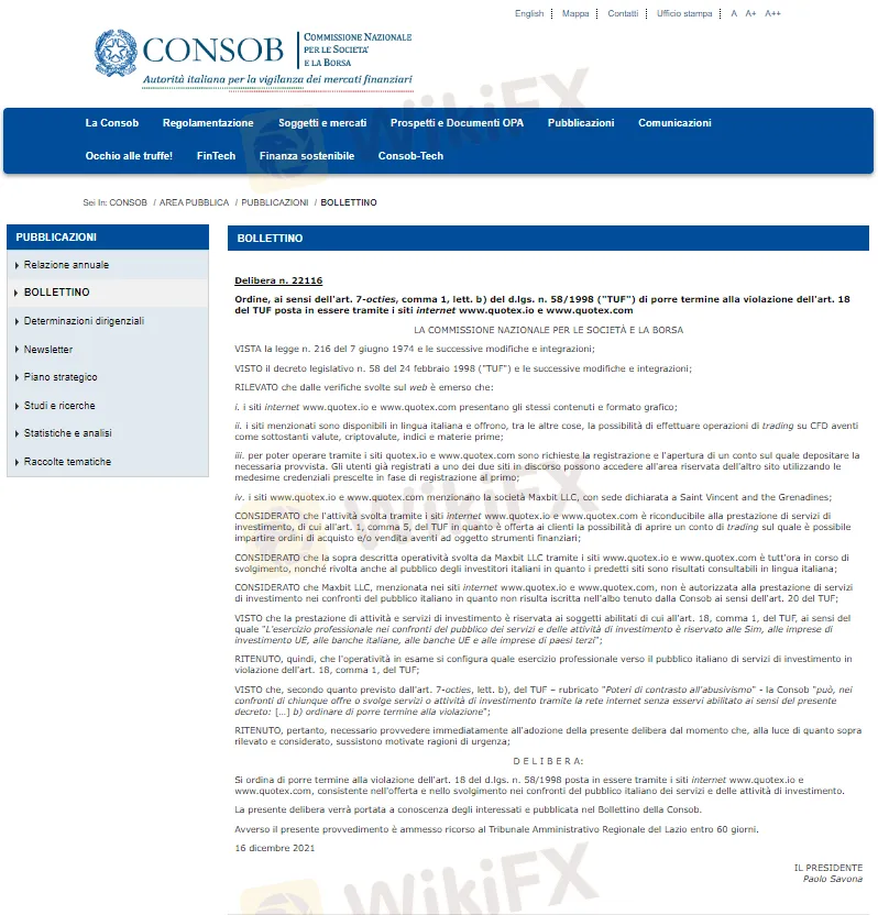 从2021年开始,意大利国家公司和证券交易所委员会(CONSOB)、西班牙国家证券市场委员会(CNMV)、葡萄牙证券市场委员会(CMVM)等监管机构就相继在官网发出警告,提示投资者QUOTEX无权在这些国家开展投资或咨询活动,警告投资者远离该平台。
