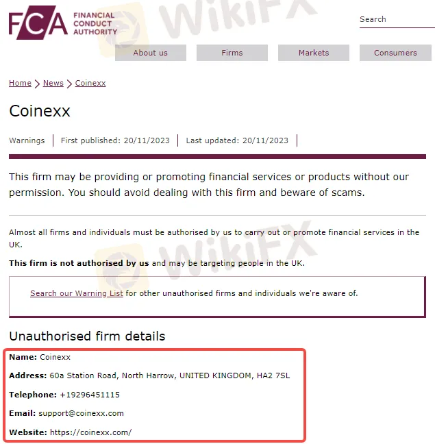 11月20日,英国金融行为监管局(FCA)发布了一则投资者警示公告,公告内容称一家名为Coinexx的公司可能在未获FCA授权的情况下,向投资者非法提供金融服务或产品。