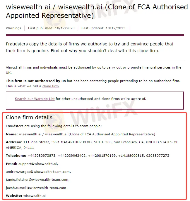 通过WikiFX查询wisewealth ai可知,该平台注册于英国,成立时间不到1年。在监管信息栏明确标记——暂未查证到有效监管信息,监管牌照存疑,展业区域存疑,存在高级风险隐患。