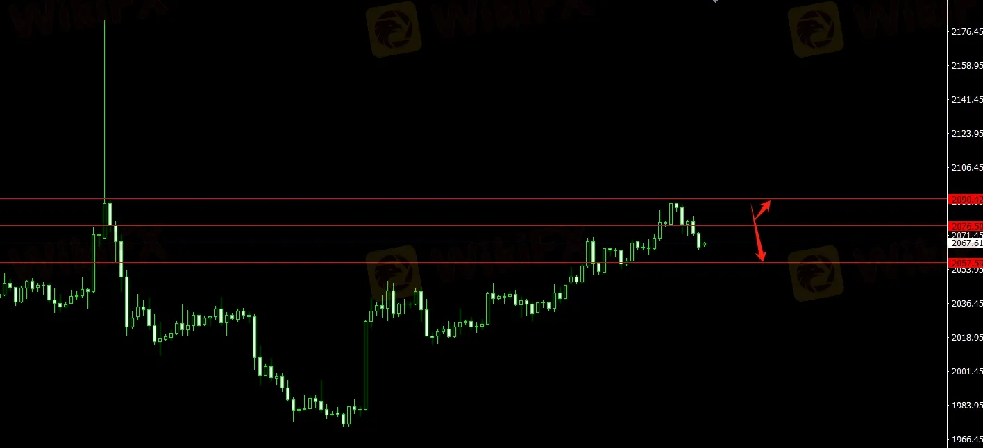 美元指数承压,黄金受支撑,关注2057.60的支撑位,4小时回调收多即可看多至压力位2090.40位置;关注2076.50压力位,4小时受阻收空即可看空至2050.40。