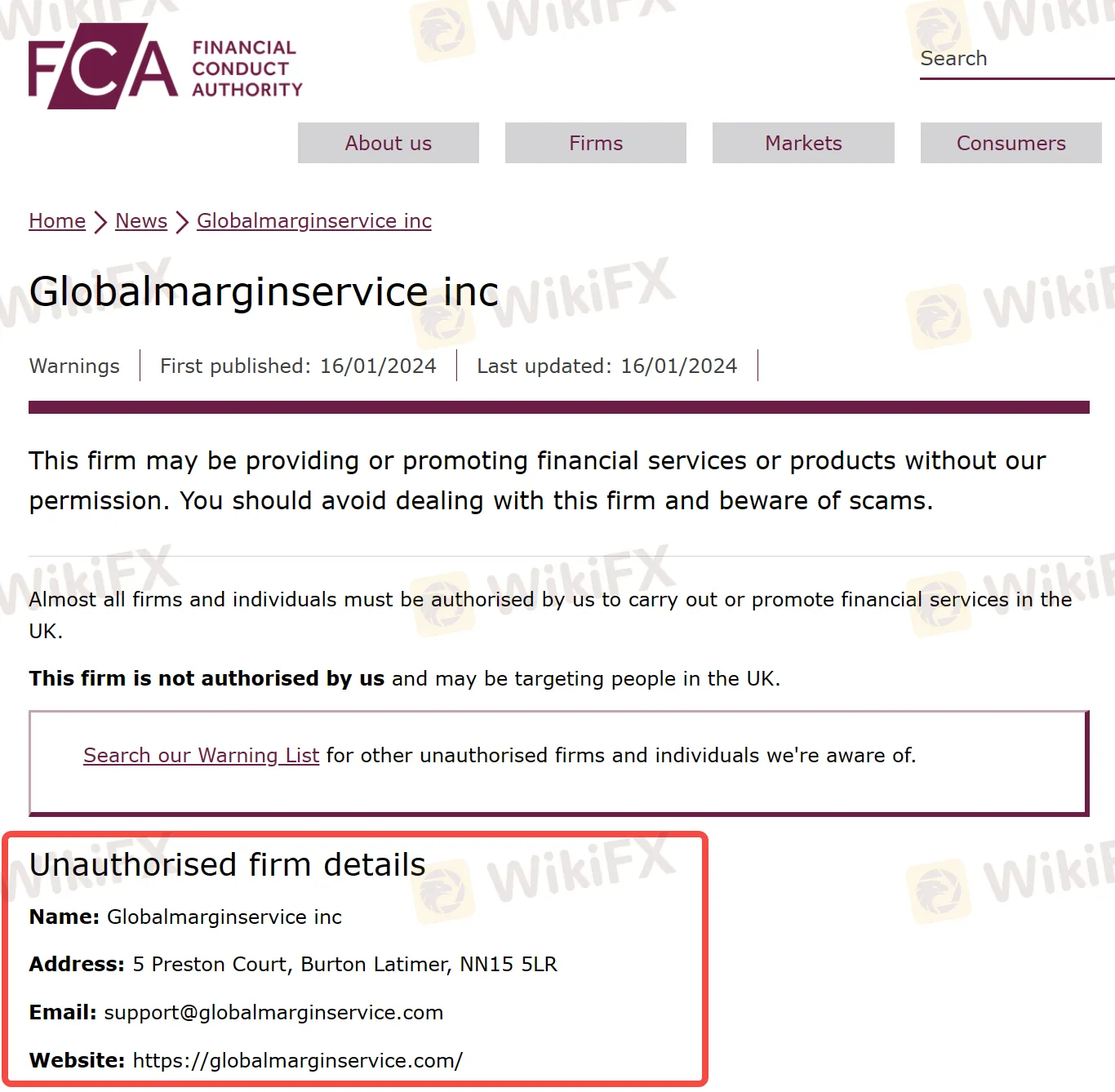 1月16日,英国金融行为监管局(FCA)发布了一则投资者警示公告,公告内容称一家名为“Globalmarginservice inc”的公司可能在未获FCA授权的情况下,向投资者非法提供金融服务或产品。