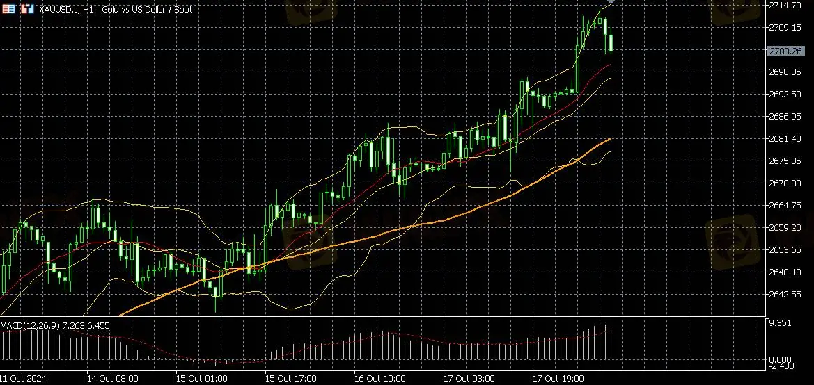 日内黄金强势突破2700美元创出新高2714后回落,现于2700点附近整理。