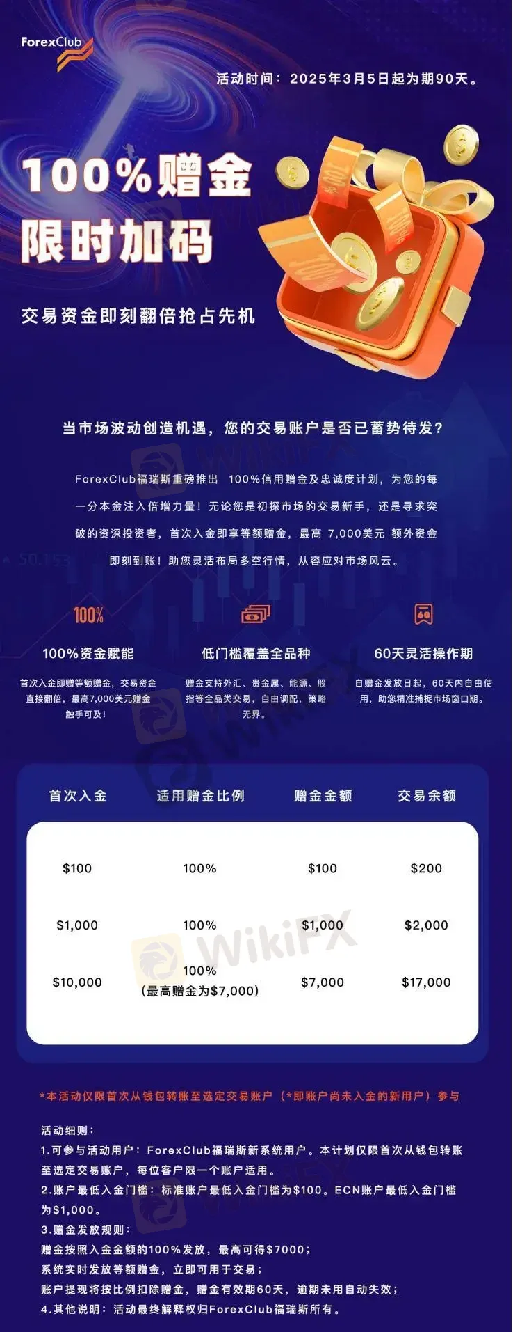 赠金按照入金金额的100%发放,最高可得$7000;