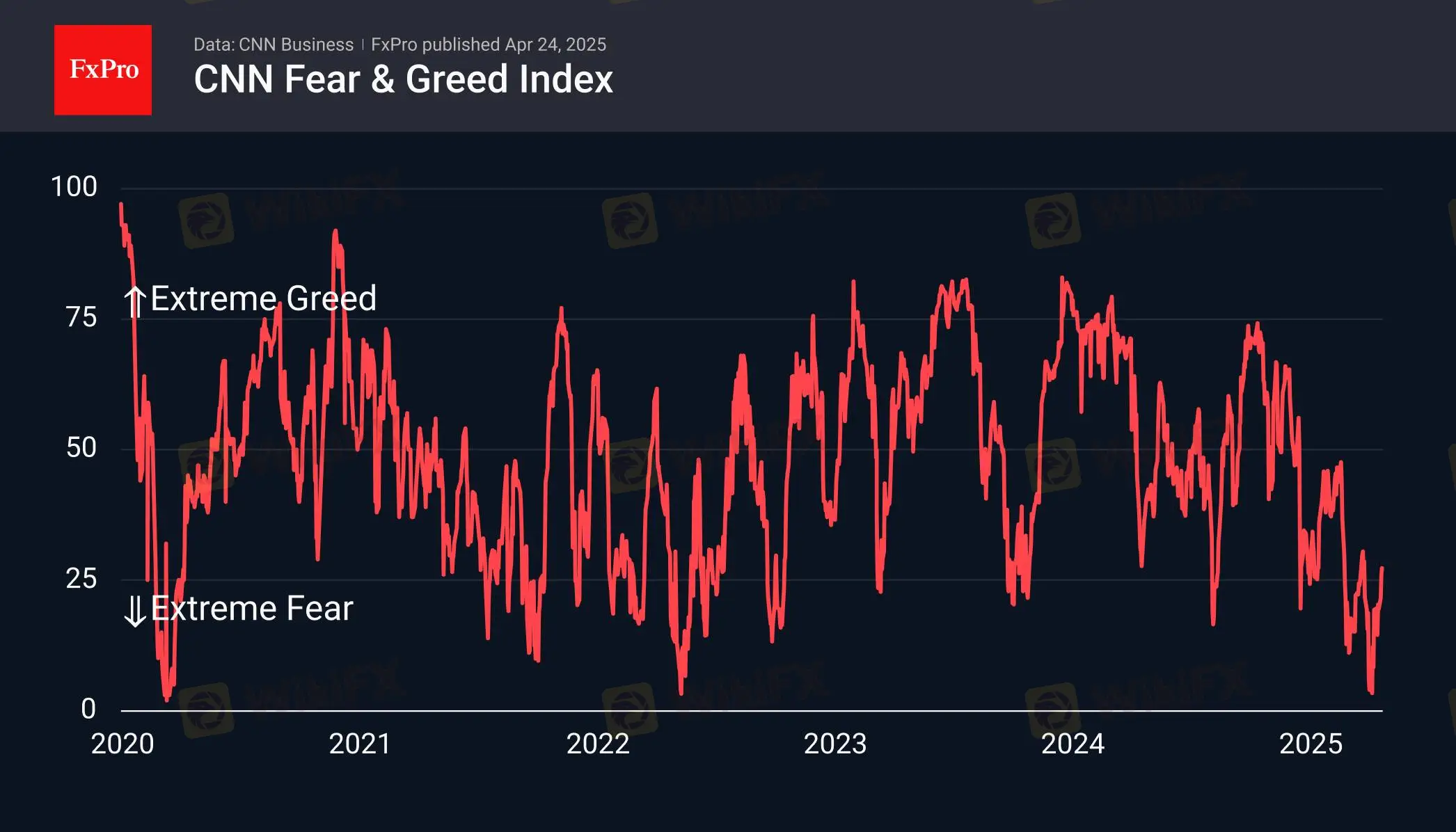 摘要:注:此文章由FxPro高级分析师Alex Kuptsikevich撰写金融市场正逐渐从近几周所受的冲击中恢复过来,这些冲击包括关税冲突以及对美联储独立性的挑战行为。尽管这些问题将还会多次出现,但市场参与者正逐渐意识到,最不确定的时刻已经过去了。股市的市场情绪已进入 “恐惧” 区间,恐惧与贪婪指数为 27。这比 4 月 8 日的低点高出 24 点,符合触底后典型的回升模式。股票指数尚未出现同样令人瞩