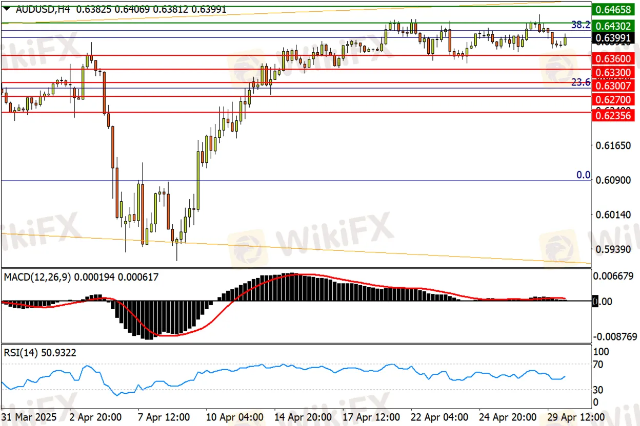 4小时图看,澳美在年内高位区形成震荡箱体,下行风险来看,3月6日高点0.6360一旦跌漏,箱体就有下破可能。更多支撑关注1月高点0.6330(也是2月20日低点和3月26日高点),该位再失,汇价多半就此转弱。点位将先后瞄准1月6日高点0.6300,以及2023年低点0.6270。后者汇聚了3月震荡区间的低位密集区,预计承接较强。指标方面,MACD在零轴上方死叉,但快线已暂止下行步伐;RSI保持于中性水平强测震荡,凸显市场强势震荡的特征。