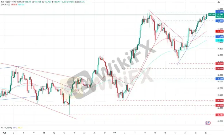 CPT Markets分析师指出,美元/日元维持在153.274水平下方盘整,以消化RSI指针的超买讯号,由于目前上涨趋势完整,目前走势仍偏向看涨。上涨方面,美元/日元目前的阻力10月10日的高点153.274,再来是2月12日的高点154.797。下跌方面,美元/日元初步的支撑为10月22日低点151.485水平,再来是10月20日低点150.272以及10月13日低点149.371。