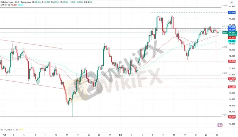 CPT Markets分析师指出,美元指数尽管周五一度下探,但受EMA50均线的支撑,目前仍继续保持在99.00的关键阻力水平下方窄幅震荡。上涨方面,美元指数目前的阻力为10月23日的高点99.173,再来是10月9日的高点99.608。下跌方面,美元指数目前的支撑为10月22日的低点98.802,接着是10月17日的低点98.069。