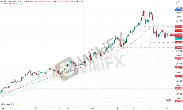 黄金价格4381美元回落后,价格持续保持在4000至EMA50均线的阻路水平下方盘整。下跌方面,黄金接下来的支撑为10月22日低4002美元,再来10月9日低点3943美元。上涨方面,黄金目前的阻力为10月22日高点4161美元,再来是10月21日的高点4381美元。