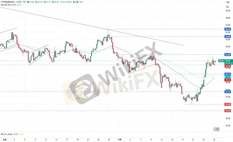 CPT Markets分析师指出,WTI原油在62.92美元下方盘整,以消化RSI指针的超买讯号。上涨方面,WTI原油目前的阻力为10月8日的高点62.92美元,再来9月29日的高点65.40美元。下跌方面,WTI原油接下来的支撑为EMA50均线所在的59.55美元,再来是10月20日的低点55.96美元。