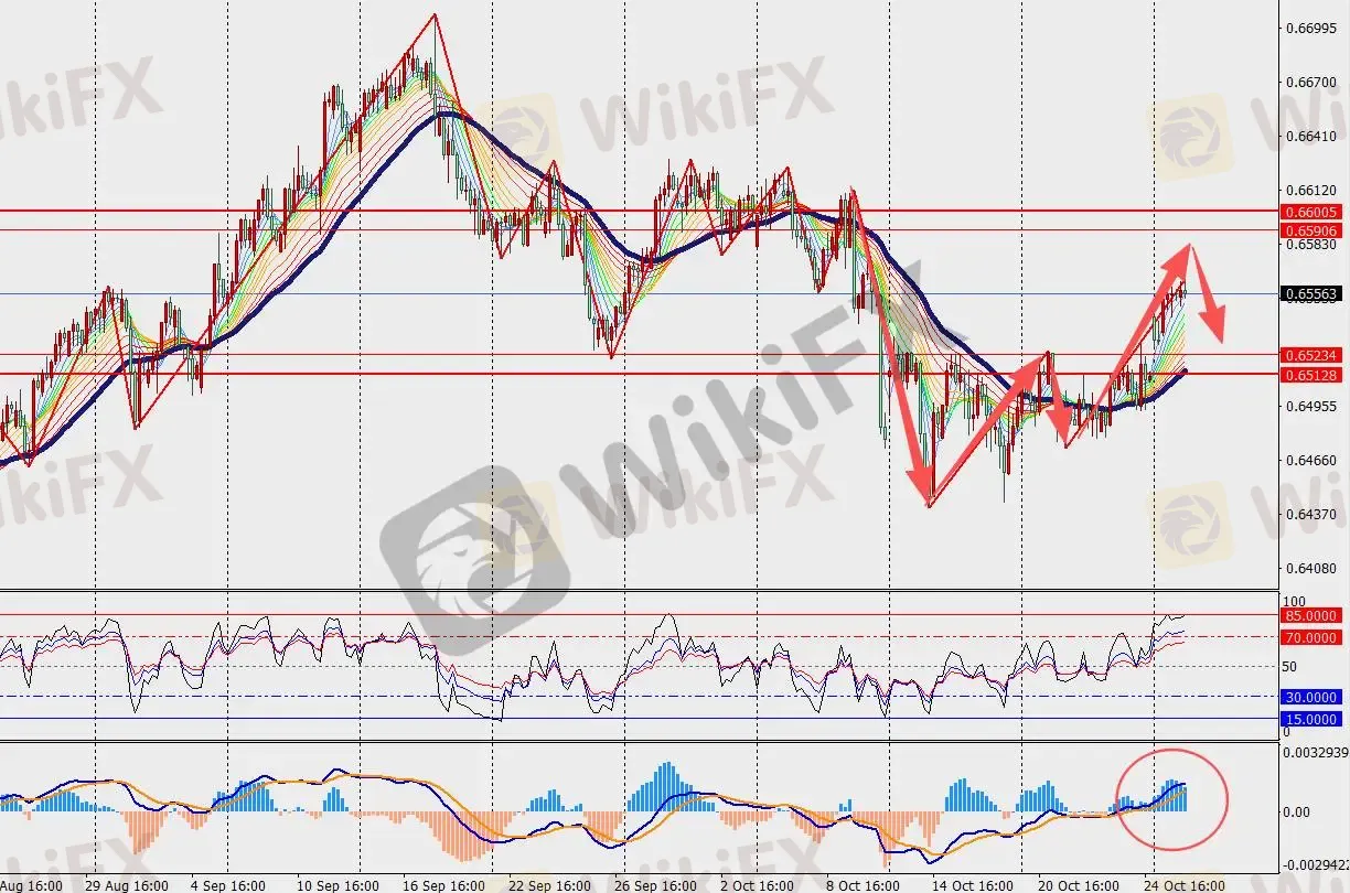技术面:澳元兑美元H4级别震荡反弹,并在48日多空分界线上方运行。然而,MACD双线和量能柱在零轴上方开始缩量。布洛克的言论被市场解读为相对鹰派,推动澳元周一震荡上行。