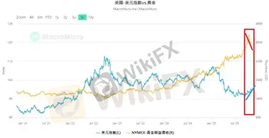 过去三年,美元指数与黄金价格的关系出现了历史罕见的「脱钩」。然而,近期走势显示,两者正重新回到传统的负相关逻辑──也就是当美元走强时,黄金走弱;当美元转弱时,黄金反弹。