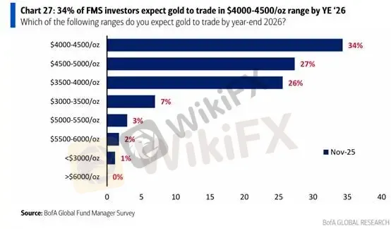 核心共识区间 ($4,000 - $5,000): 合计有 61% 的投资者预期,到 2026 年底金价将落在每盎司 4,000 美元至 5,000 美元之间。34% 的投资者看好 $4,000 - $4,500 区间。