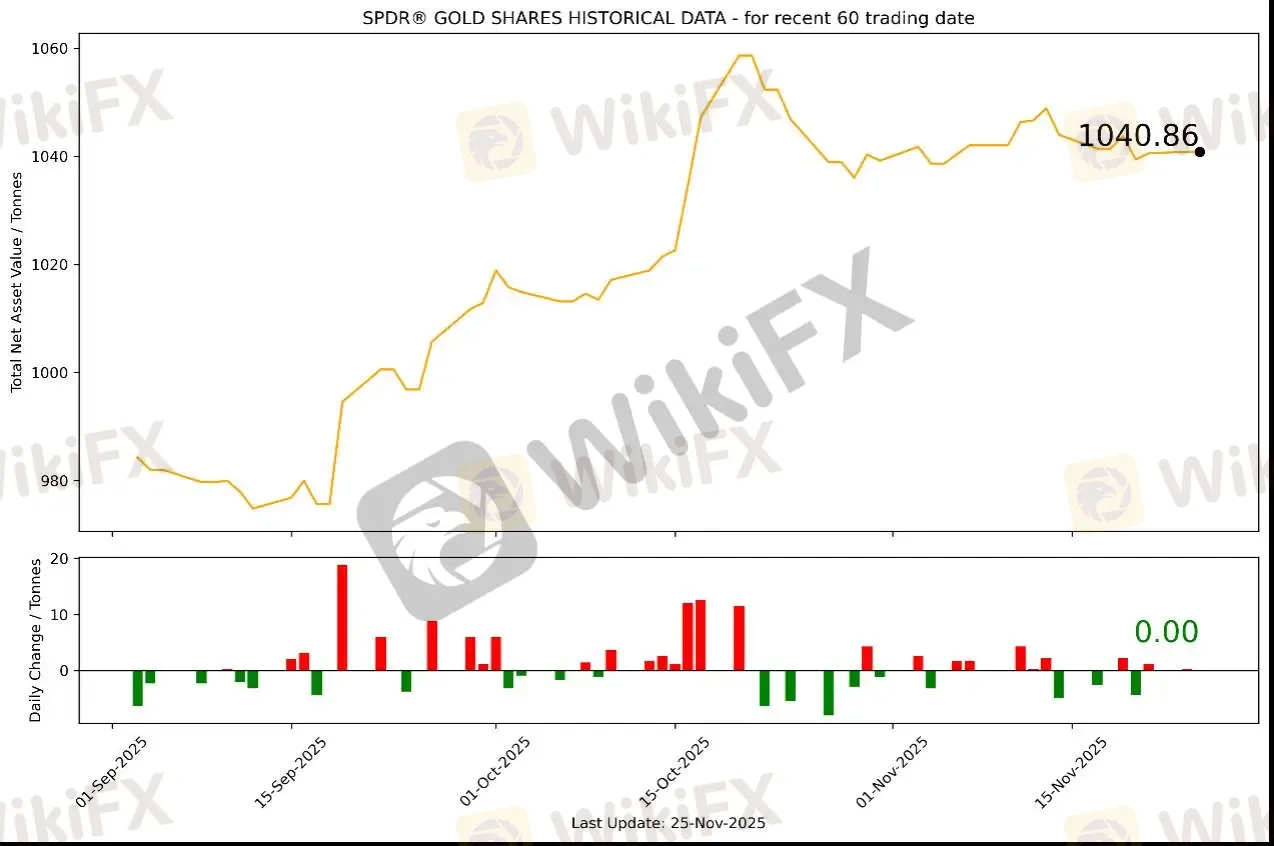 截至11月25日,全球最大的黄金ETF SPDR Gold Trust持仓量为1040.86吨,与上一个交易日持平。11月25日现货黄金多次在4150美元/盎司附近受到压制,每次冲高都迅速回落;下方则在4112美元/盎司附近获得支撑。整体走出典型的箱体震荡结构。最高向上触及4159.47美元/盎司,最低向下触及4109.72美元/盎司。最终收于4130.425美元/盎司,跌4.294美元或0.1%。