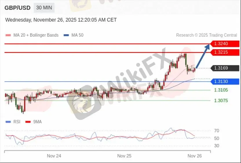 交易策略: 在 1.3130 之上,看涨,目标价位为 1.3215 ,然后为 1.3240。
