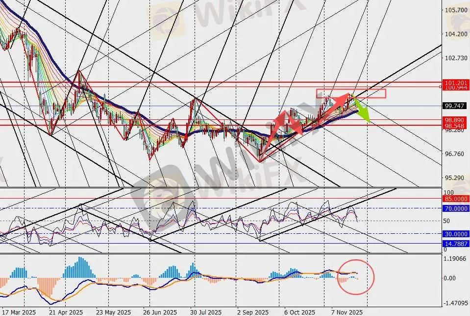美元指数日线级别震荡回落,MACD双线和量能柱向下扩张。薪资处理公司ADP周二报告称,由于过去几周裁员步伐加快,美国劳动力市场显示出进一步走弱的迹象。在过去四周内,私营企业平均每周减少了13500个工作岗位。