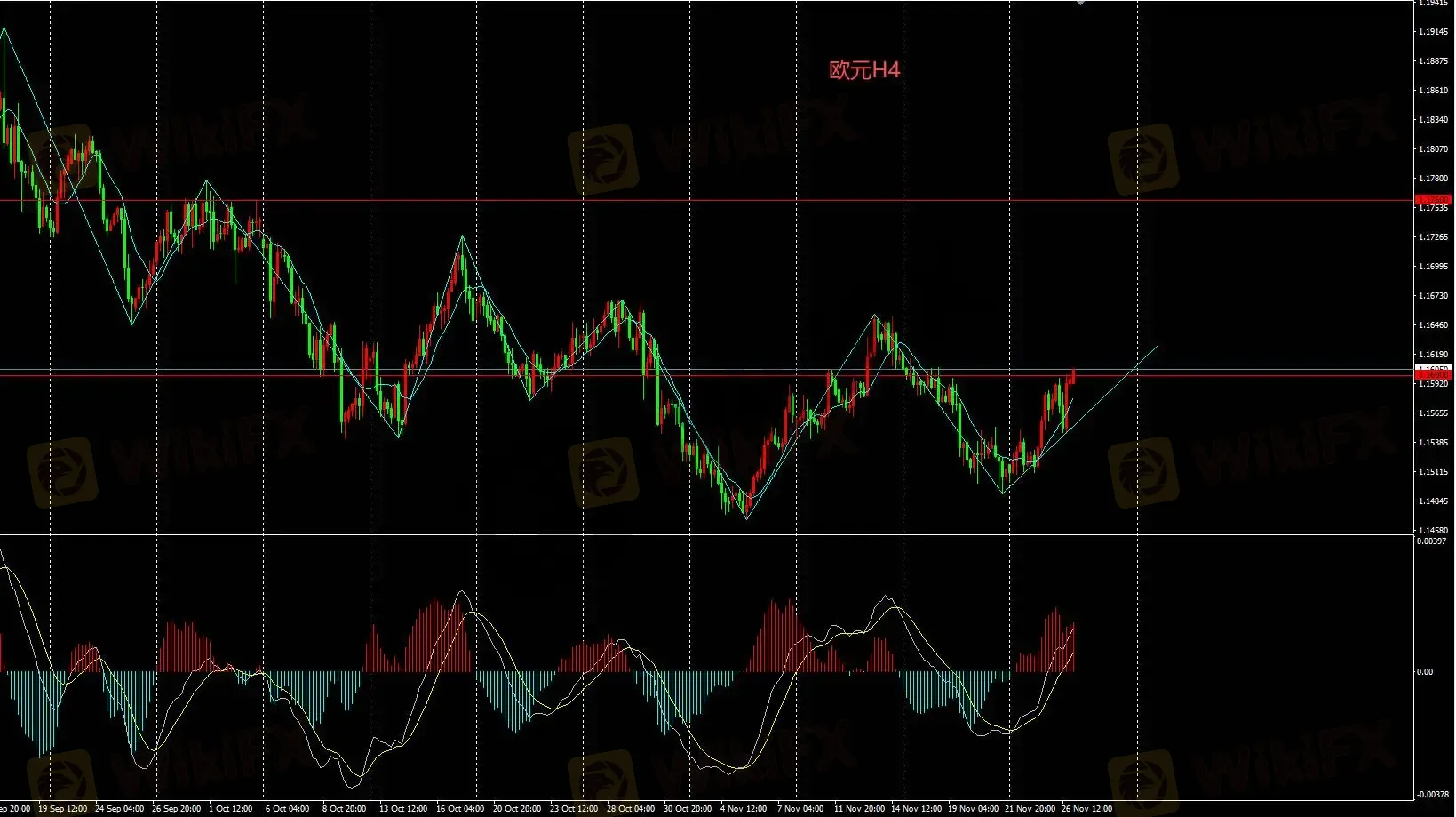 欧元H4价格重回1.16重要关口,当前H4仍为下跌震荡走势,是否打开进一步上涨空间的关键是1.165。