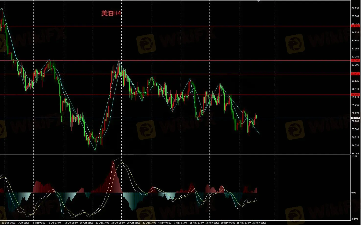 美油价格持续维持在60关口下方震荡走低,震荡走低态势。