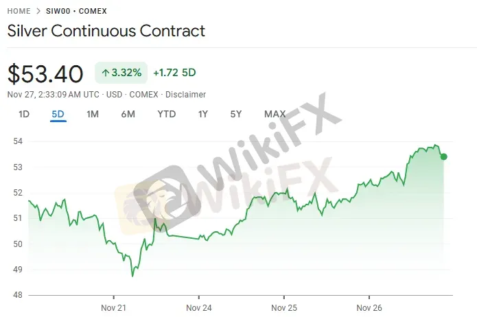 11 月 26 日至 27 日,白银(XAG/USD)周三大幅上涨,盘中交易价格约为每盎司 52.45 美元,日内涨幅达 2%。受美国国债收益率持续走低及投资者转向无利息资产的推动,白银延续近期上行趋势,市场看涨情绪明显升温。