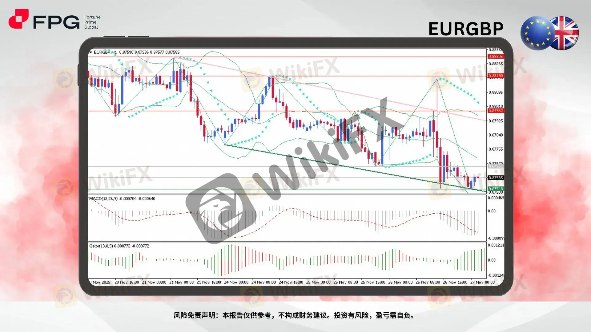 动能指标强化了偏空观点。MACD 柱线维持在零轴下方,信号线横向运行,显示空头仍占优势,但卖压略有减弱。Gator 指标显示市场可能在积蓄动能,准备迎接方向性突破。这种收缩意味着若价格有效突破 0.8798 上方或跌破 0.8751,下一个大幅波动可能出现。