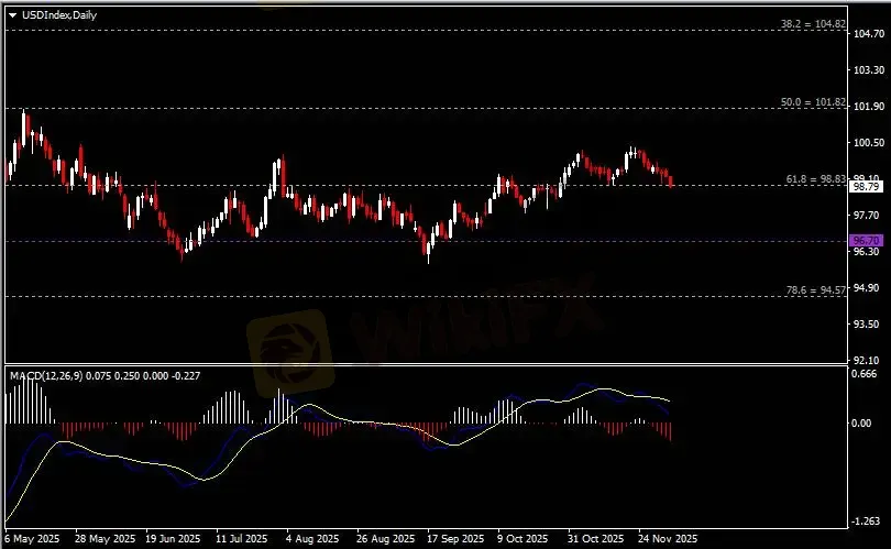 日线图显示美元指数震荡下挫,当前测试98.80支撑。从MACD来看,快慢线向下运行,红色动能柱温和放量。指数走势基本和动能柱的变化一致。