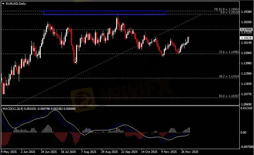 日线图显示欧元兑美元震荡上行,当前企稳于1.15关键支撑。从MACD来看,快慢线向上运行,白色动能柱温和放量。汇价走势基本和动能柱的变化一致。